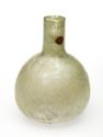 DescriptionIrridescent silvery transluscent glass. Top of neck rough, possibly trimmed after making. Cylindrical neck; bulging coniod body; concave on bottom.